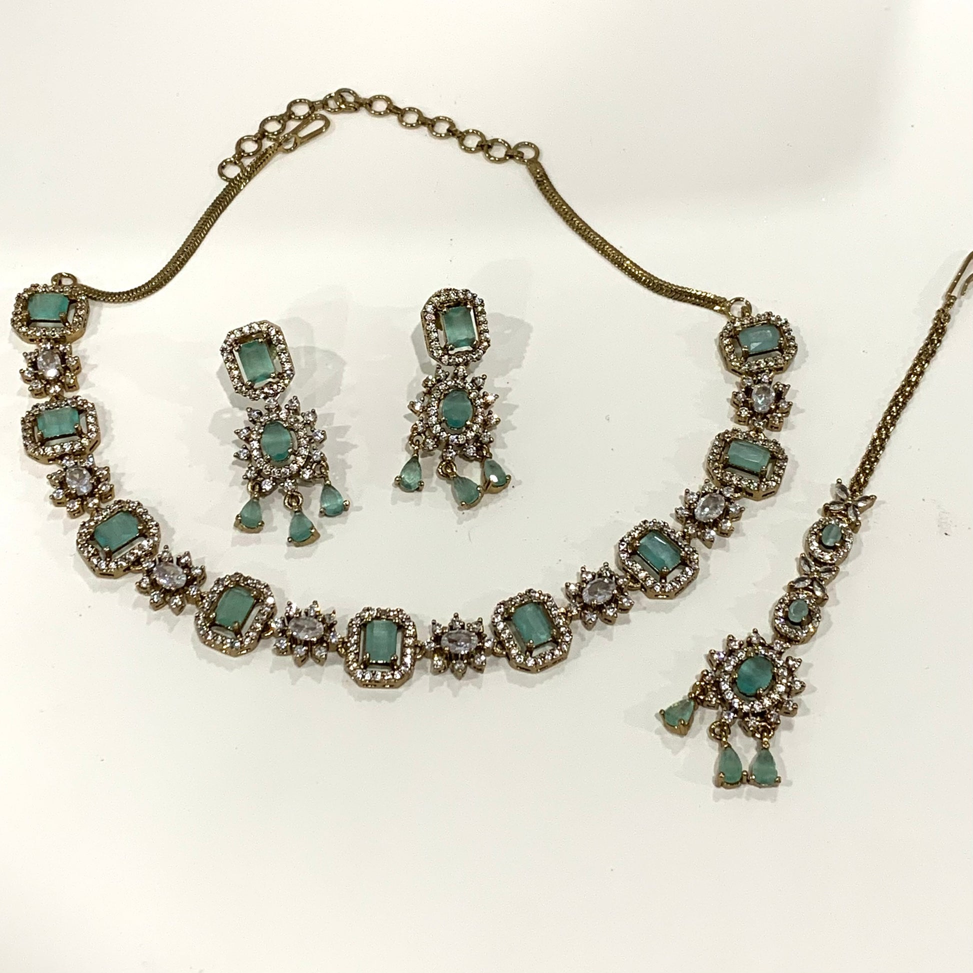 Add a touch of elegance to any outfit with our American Diamond Necklace Set. This sleek set features a stylish combination of mint and gold, making it a versatile addition to any jewelry collection. With its delicate design and high-quality materials, this necklace set is sure to elevate your style.