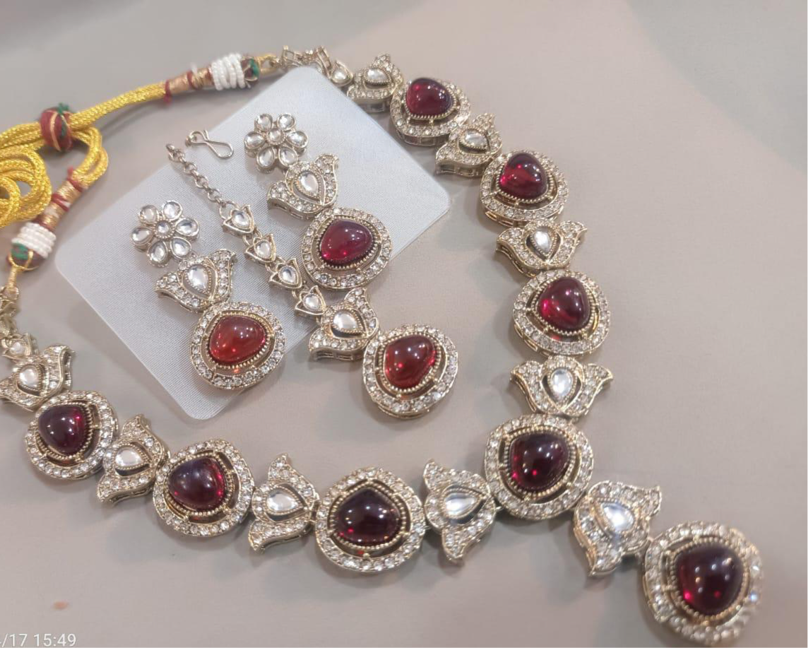 This elegant necklace set features a beautiful maroon pendant that adds a touch of sophistication to any outfit. This set is perfect for any occasion. Elevate your style with this must-have accessory.