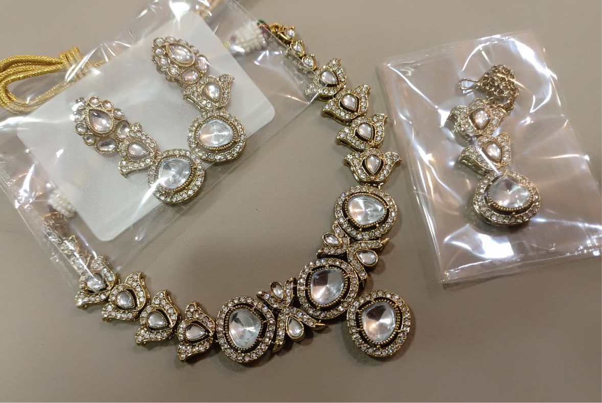 This elegant necklace set features a pendant adorned with a sparkling clear stone, adding a touch of sophistication to any outfit. Functional and stylish, this set is perfect for any occasion. It is a timeless addition to any jewelry collection.