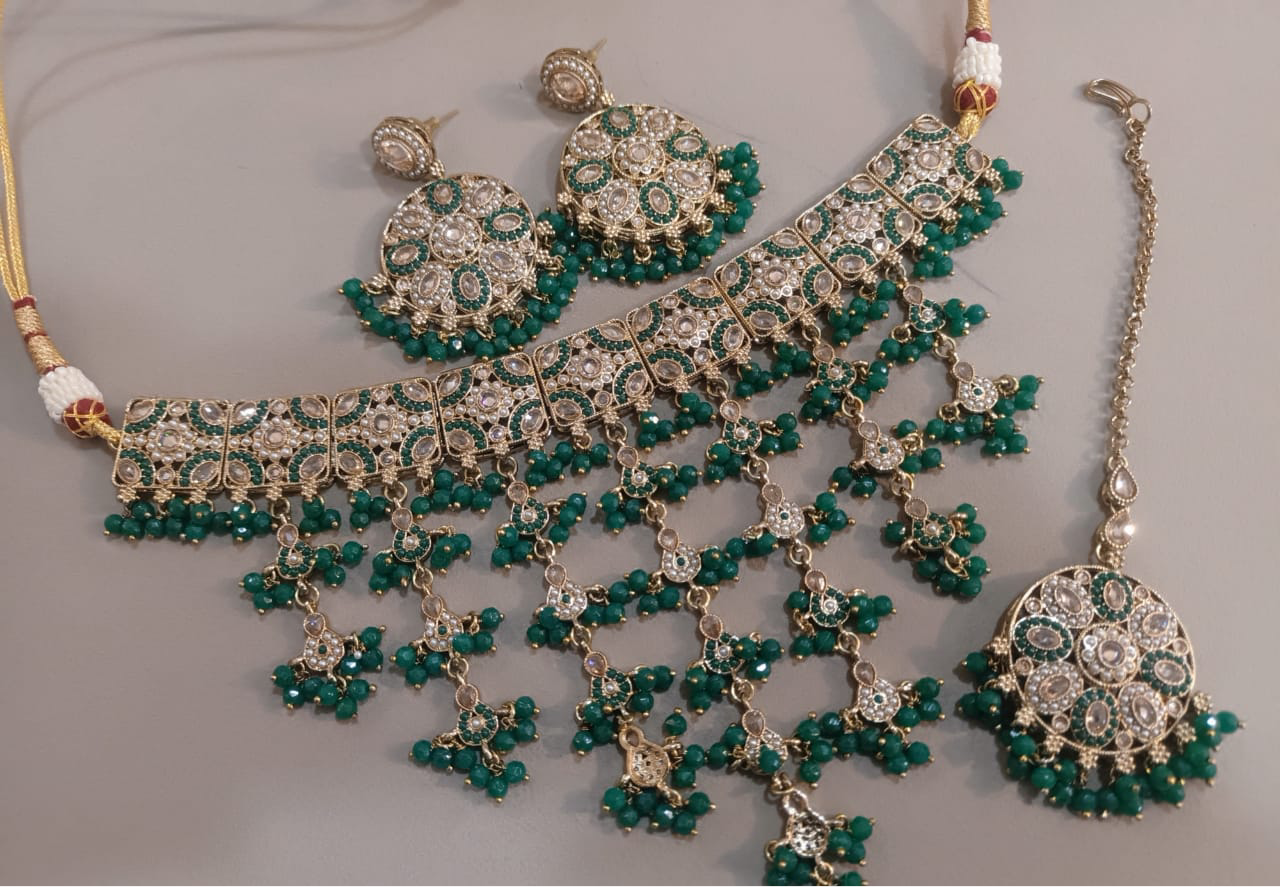 Expertly crafted with a vibrant green hue, the Polki Waterfall Choker Set adds a pop of colour to any outfit. Made with quality materials, this set is designed for comfort and durability. Elevate your style with this unique and eye-catching accessory.